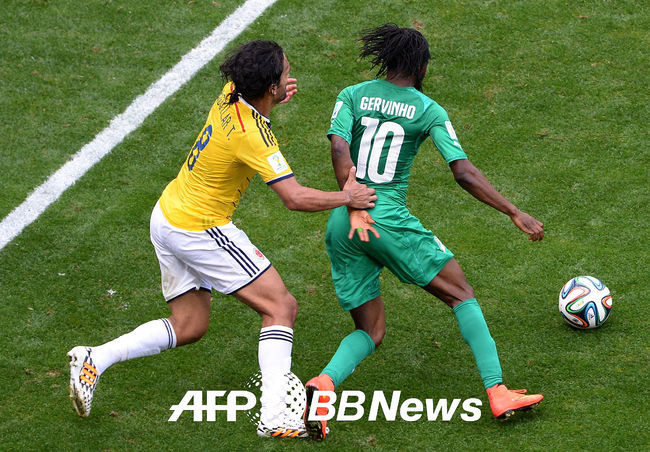 콜롬비아 아벨 아길라르가 코트디부아르 제르비뉴를 수비하고 있다./ photo@osen.co.kr < 사진 > ⓒAFPBBNews = News1