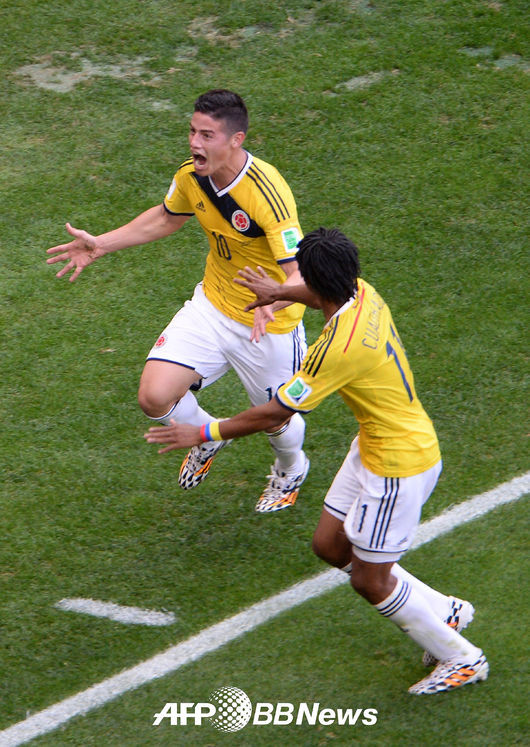 콜롬비아 로드리게스가 선제골을 넣고 동료선수와 기뻐하고 있다./ photo@osen.co.kr < 사진 > ⓒAFPBBNews = News1