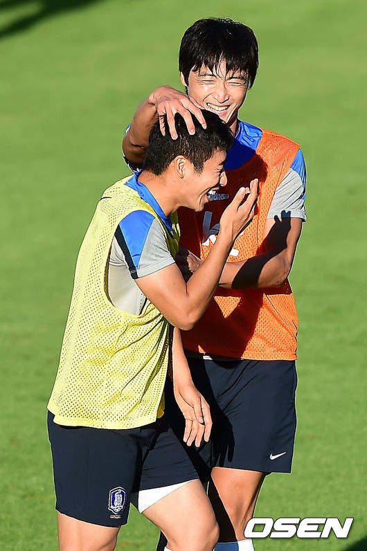 20일 오전(이하 한국시간) 홍명보 감독이 이끄는 축구국가대표팀이 브라질 이구아수의 페드로 바소경기장에서 훈련을 가졌다. 패싱게임 중 이근호가 곽태휘의 팔에 얼굴을 살짝 맞자 곽태휘가 이근호의 머리를 쓰다듬으며 사과하고 있다.