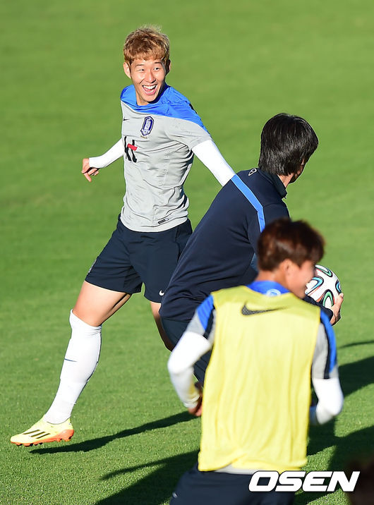 20일 오전(이하 한국시간) 홍명보 감독이 이끄는 축구국가대표팀이 브라질 이구아수의 페드로 바소경기장에서 훈련을 가졌다. 패싱게임 중 손흥민이 홍명보 감독에게 볼을 달라고 하고 있다.