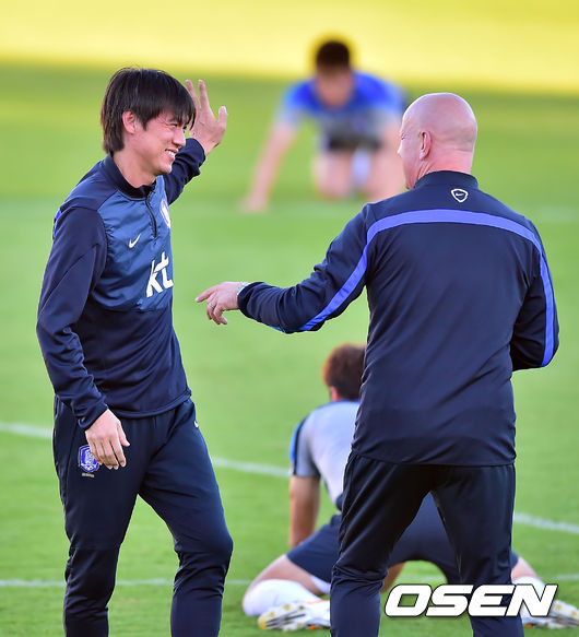 20일 오전(이하 한국시간) 홍명보 감독이 이끄는 축구국가대표팀이 브라질 이구아수의 페드로 바소경기장에서 훈련을 가졌다. 홍명보 감독이 안톤 코치와 얘기를 나누며 환하게 웃고 있다.