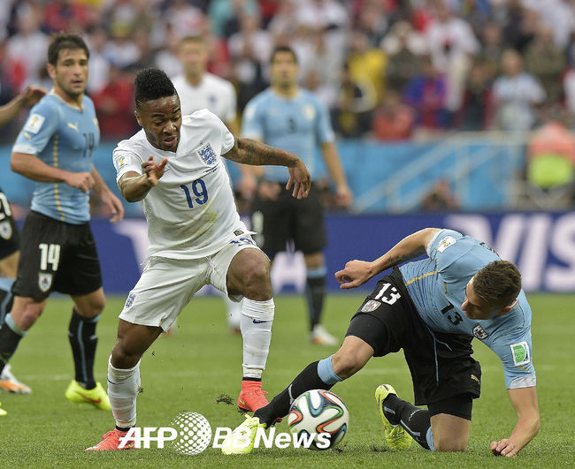 잉글랜드 라힘 스털링이 우루과이 호세 마리아 기메네즈의 수비를 피해 드리블하고 있다. / photo@osen.co.kr < 사진 > ⓒAFPBBNews = News1