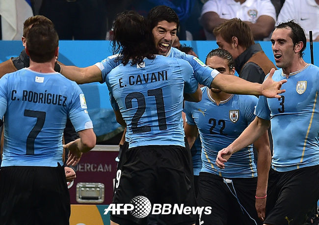 우루과이 수아레스가 선제골을 넣고 카바니를 비롯한 동료선수들과 기뻐하고 있다./ photo@osen.co.kr < 사진 > ⓒAFPBBNews = News1