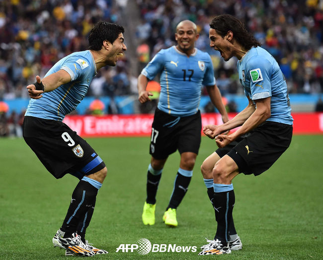 우루과이 수아레스가 선제골을 넣고 카바니를 비롯한 동료선수들과 기뻐하고 있다./ photo@osen.co.kr < 사진 > ⓒAFPBBNews = News1