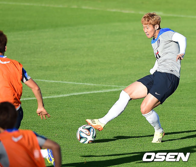 20일 오전(이하 한국시간) 홍명보 감독이 이끄는 축구국가대표팀이 브라질 이구아수의 페드로 바소경기장에서 훈련을 가졌다. 패싱게임중 손흥민이 돌파를 하고 있다.