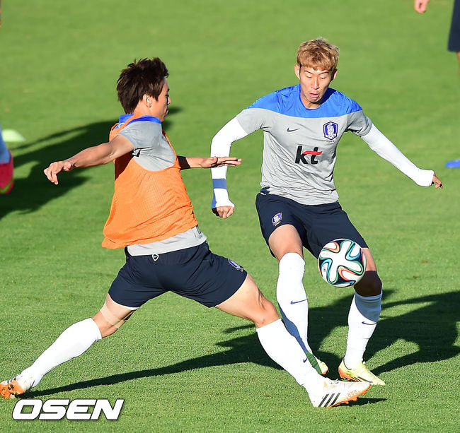20일 오전(이하 한국시간) 홍명보 감독이 이끄는 축구국가대표팀이 브라질 이구아수의 페드로 바소경기장에서 훈련을 가졌다. 구자철과 손흥민이 볼다툼을 하고 있다.