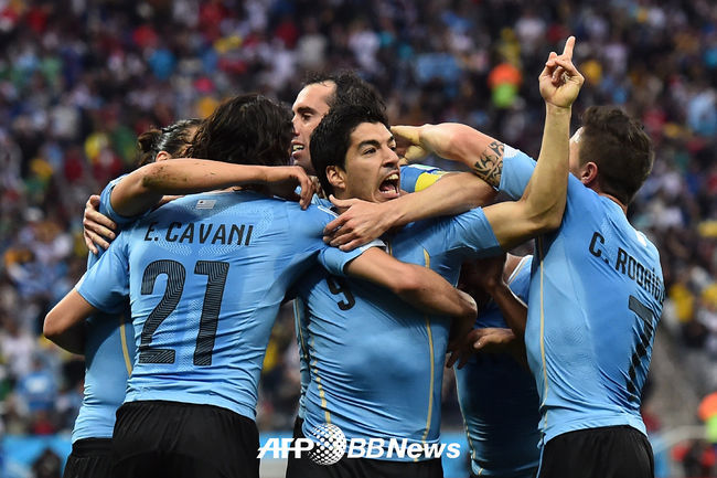 우루과이 수아레스가 헤딩슛으로 선제골을 넣고 동료선수들과 기뻐하고 있다./ photo@osen.co.kr < 사진 > ⓒAFPBBNews = News1