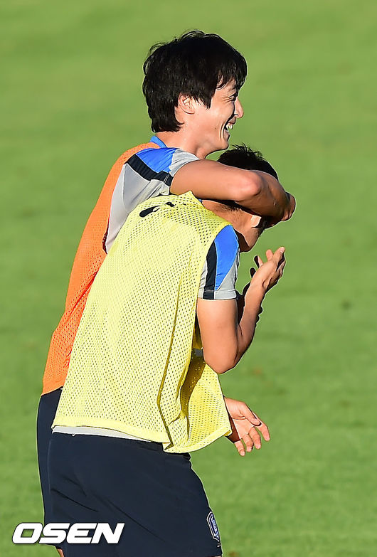 20일 오전(이하 한국시간) 홍명보 감독이 이끄는 축구국가대표팀이 브라질 이구아수의 페드로 바소경기장에서 훈련을 가졌다. 패싱게임 중 이근호가 곽태휘의 팔에 얼굴을 살짝 맞자 곽태휘가 이근호의 머리를 쓰다듬으며 사과하고 있다.