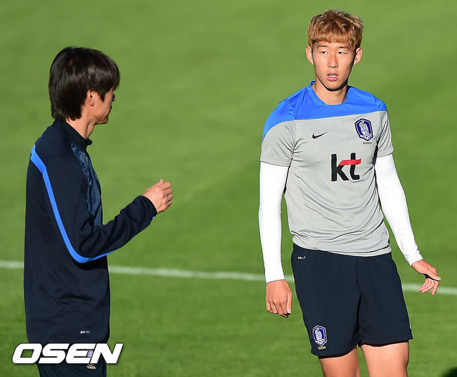 20일 오전(이하 한국시간) 홍명보 감독이 이끄는 축구국가대표팀이 브라질 이구아수의 페드로 바소경기장에서 훈련을 가졌다. 손흥민과 홍명보 감독이 얘기를 나누고 있다.