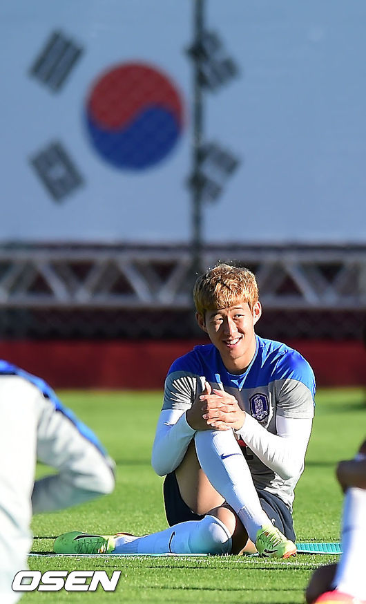20일 오전(이하 한국시간) 홍명보 감독이 이끄는 축구국가대표팀이 브라질 이구아수의 페드로 바소경기장에서 훈련을 가졌다. 손흥민이 몸을 풀며 환하게 미소짓고 있다.