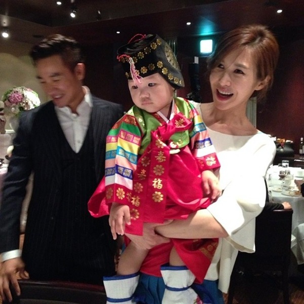 사진 속에는 첫 돌을 맞아 한복을 입은 엄지온 양과 행복한 미소를 짓는 엄태웅, 윤혜진의 모습이 담겼다.