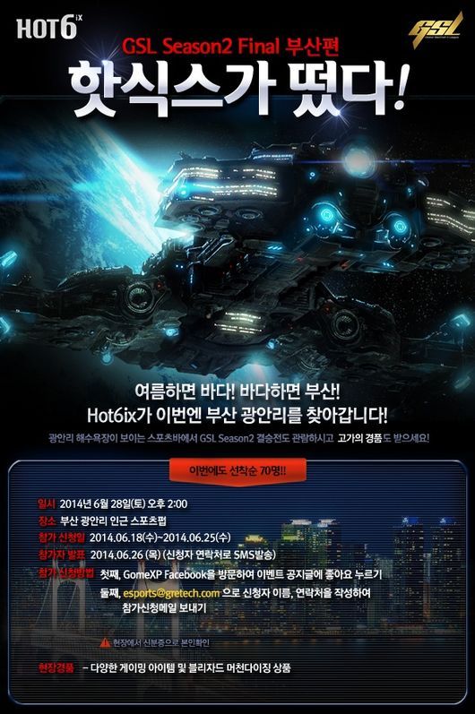 2014 GSL(Global StarCraft� II League)의 올해 연간 스폰서인 핫식스가 GSL 결승전 당일 전국의 팬들을 찾아가는 ‘핫식스가 떴다’ 시즌2를 부산 광안리에서 진행한다고 20일 밝혔다. ‘핫식스가 떴다!’ 시즌2는 오는 6월 28일 토요일 오후2시부터 부산 광안리 해수욕장 인근에 위치한 스포츠펍 ‘탑앤타파스’에서 진행될 예정이다.