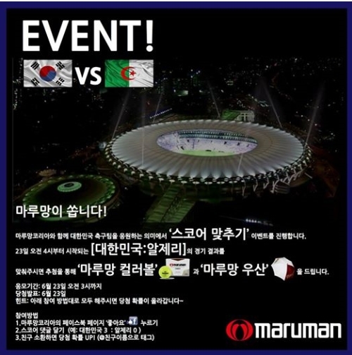 마루망코리아는(대표 김석근)가 대한민국 두 번째 H조 예선을 앞두고 승리 염원을 위한 ‘알제리전 스코어 맞추기’ 공식 페이스북 이벤트를 실시한다.