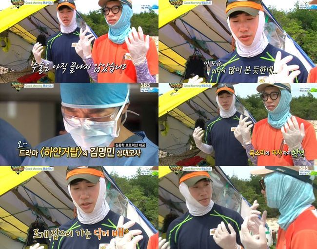 이날 방송에서 배성재와 봉태규는 김병만을 도와 조개를 캐기 위해 나섰다. 안전을 위해 준비해 온 장갑을 낀 배성재는 마치 의사들이 수술 전 착용하는 장갑과 같은 장갑의 모습에 바로 김명민 성대모사를 시도했다.