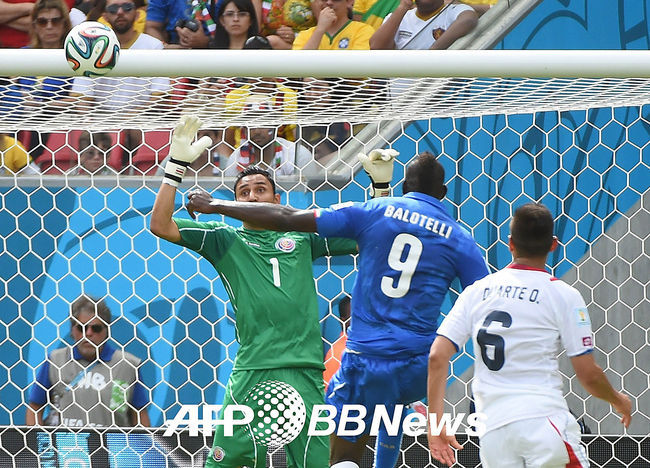 이탈리아 발로텔리의 슈팅을 코스타리카 골키퍼 케일러 나바스가 막아내고 있다.