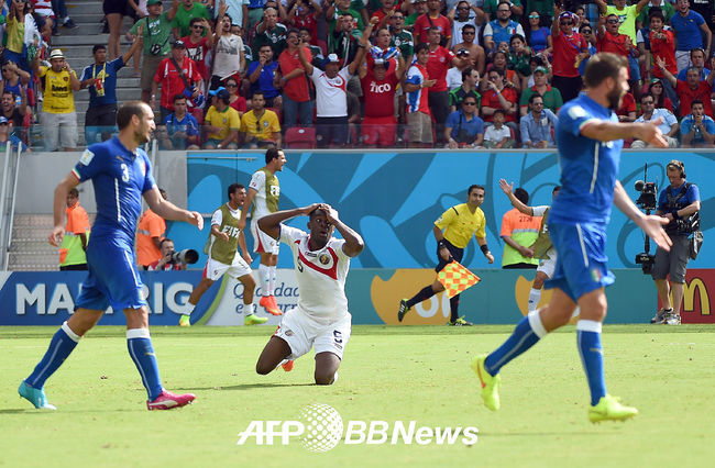 전반 코스타리카 조엘 켐벨이 페널티 박스 안에서 이탈리아 바르잘리와 키엘리니의 수비에 걸려 넘어진 뒤 페널티킥 판정을 받지 못하자 아쉬워하고 있다.