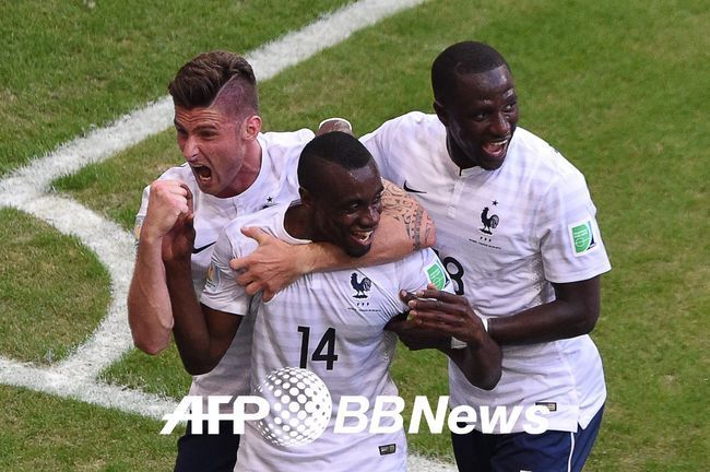 선제골은 프랑스였다. 전반 17분 코너킥 상황에서 지루가 헤딩슛을 터트려 골망을 흔들었다. 이번 브라질 월드컵 통산 100호 골이었다. 프랑스는 1-0 리드를 잡았다. 이어 단 30초 뒤 프랑스는 벤제마가 가로챈 공을 블레즈 마투이디가 추가골로 터트렸다.