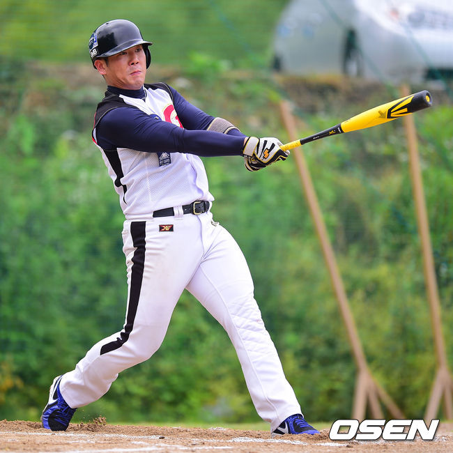 21일 경기도 양평 솔뜰야구장에서 '제5회 니베아맨 컵 전국 생활체육인 야구대회 안양 GMB과 GS칼텍스 본사야구단의 경기, 1회초 무사 2,3루 안양GMB 유희훈이 선취 1타점 적시타를 날리고 있다.