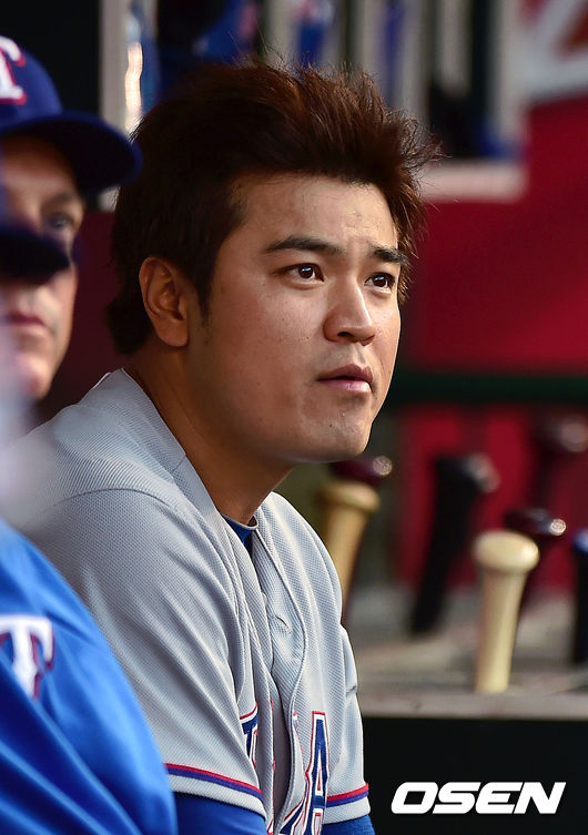 텍사스 추신수가 더그아웃에 앉아 그라운드를 바라보고 있다.