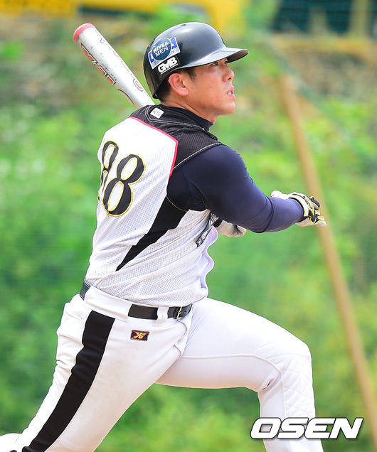 21일 경기도 양평 솔뜰야구장에서 '제5회 니베아맨 컵 전국 생활체육인 야구대회 안양 GMB과 GS칼텍스 본사야구단(GStorms)의 경기,4회초 2사 2,3루 안양GMB 유희훈이 2타점 적시타를 날리고 있다.