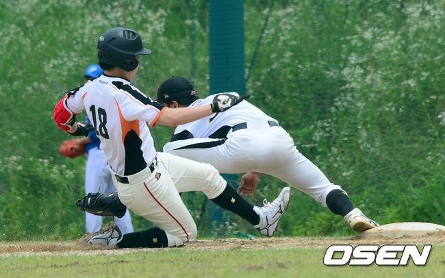 21일 경기도 양평 솔뜰야구장에서 '제5회 니베아맨 컵 전국 생활체육인 야구대회 안양 GMB과 GS칼텍스 본사야구단의 경기, 1루 귀루중 아웃당하는 GSTORMS 이승준 선수.