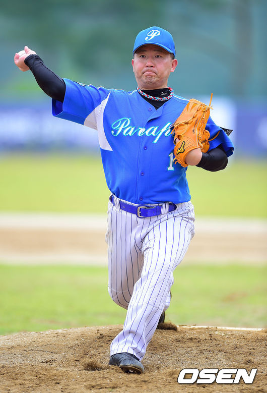 21일 경기도 양평 솔뜰야구장에서 '제5회 니베아맨 컵 전국 생활체육인 야구대회 파라파와 서대전고 동문팀의 경기, 1회말 파라파 선발투수 유춘회가 역투하고 있다.