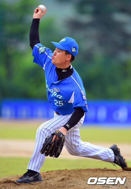 21일 경기도 양평 솔뜰야구장에서 '제5회 니베아맨 컵 전국 생활체육인 야구대회 파라파와 서대전고 동문팀의 경기, 1회말 파라파 박기수 투수가 역투하고 있다