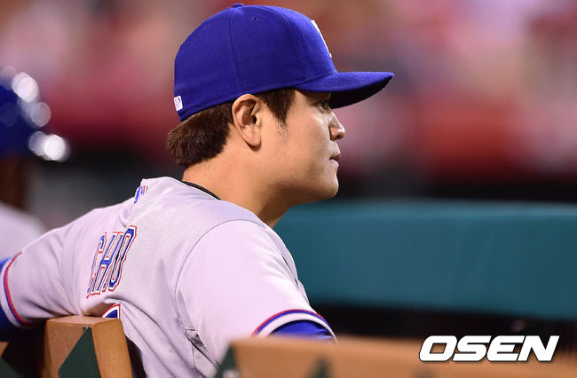 텍사스 추신수가 5회초 2사 1,2루때 2루수 앞 땅볼로 물러난 뒤 더그아웃에 앉아 그라운드를 바라보고 있다.