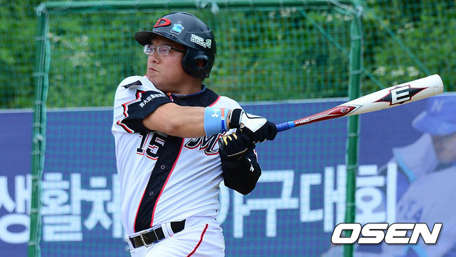 21일 경기도 양평 솔뜰야구장에서 '제5회 니베아맨 컵 전국 생활체육인 야구대회 파라파와 서대전고 동문회의 경기, 2회말 서대전고 동문회 김태형이 1:1 균형을 깨는 적시안타를 쳐내고 있다.