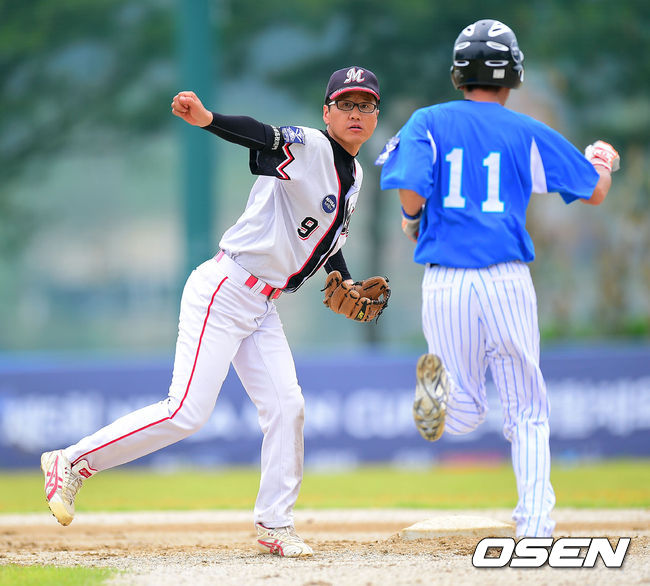 21일 경기도 양평 솔뜰야구장에서 '제5회 니베아맨 컵 전국 생활체육인 야구대회 파라파와 서대전고 동문팀의 경기,4회말 무사 1루 파라파 최민관의 병살타때 서대전고 동문팀 성춘모 2루수가 1루 주자 구원회를 포스아웃 시키고 1루로 송구하고 있다.