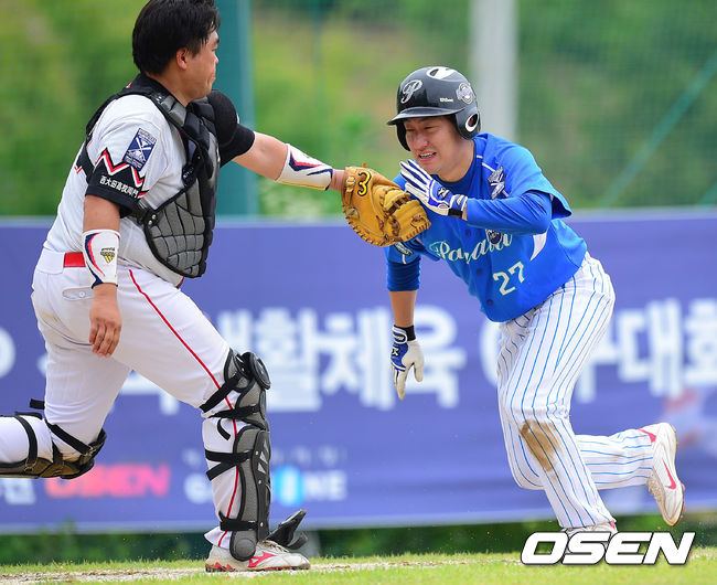 21일 경기도 양평 솔뜰야구장에서 '제5회 니베아맨 컵 전국 생활체육인 야구대회 파라파와 서대전고 동문팀의 경기,4회말 2사 1루 파라파 신경호의 2루타때 홈쇄도한 1루 주자 안태우가 서대전고 동문팀 박동수에게 태그아웃되고 있다