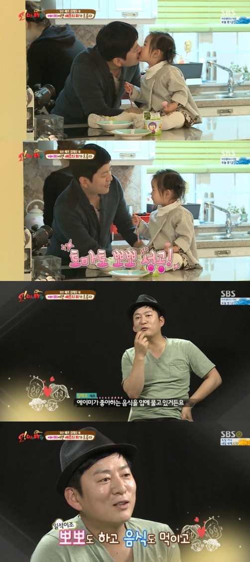 강레오는 21일 오후 방송된 SBS 예능프로프램 '오 마이 베이비'에서 딸 에이미와 뽀뽀하기 위해 토마토를 입에 물고 다가갔다. 에이미는 토마토를 먹기 위해 아빠의 입에 뽀뽀를 했다.