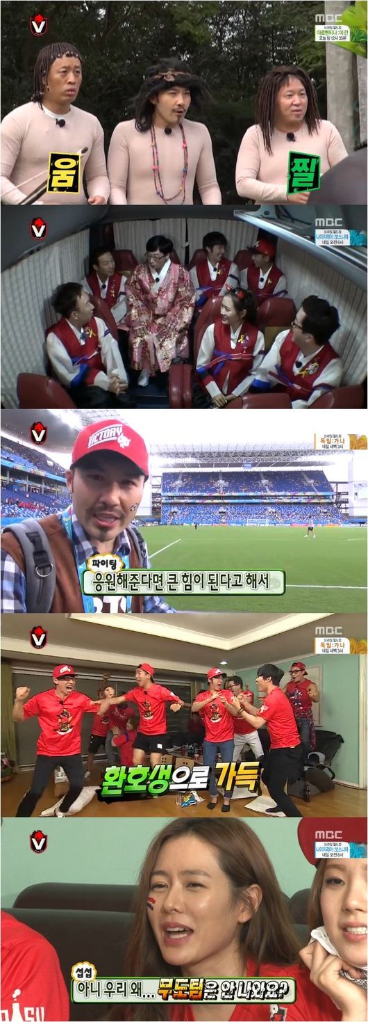 이날 멤버들은 한국과 러시아의 경기를 응원했다. ‘무한도전’은 1진과 2진으로 나뉘어 지난 15일과 18일 이틀에 걸쳐 브라질로 출국했다. 정준하, 정형돈, 노홍철은 러시아 경기를 현지에서 관람했고, 다른 멤버들은 한국에서 응원했다.