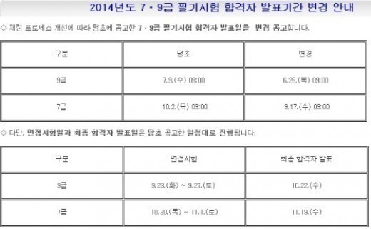 당초 9급 공채 합격자 발표는 7월 9일 오전 9시에 있을 예정이었으나 이는 오는 26일 오전 9시로 변경됐다. 7급은 10월 2일 오전 9시에서 9월 17일 오전 9시로 합격자 발표일이 앞당겨졌다. 면접시험일과 최종 합격자 발표일은 당초 공고한 일정대로 진행된다.