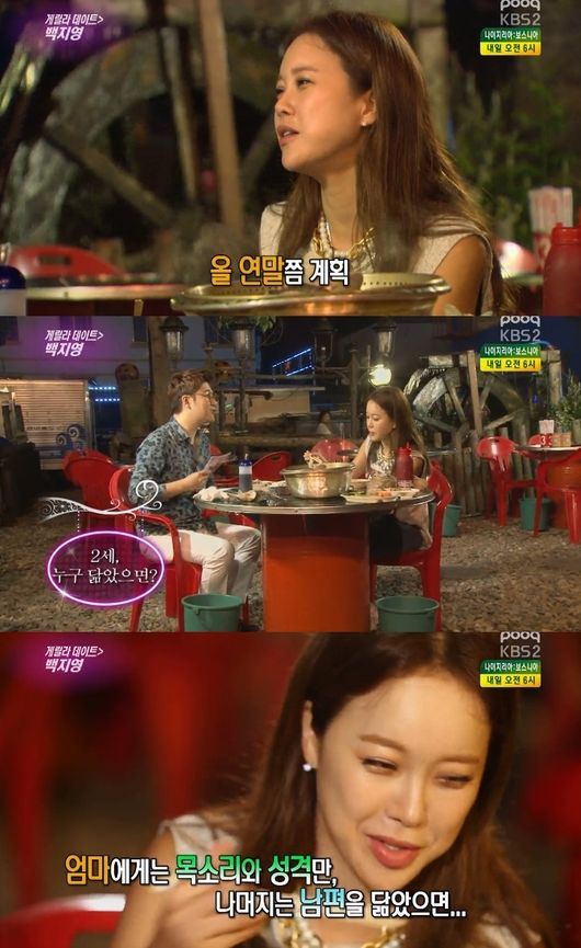 백지영은 21일 방송된 KBS 2TV '연예가중계'와의 게릴라 데이트에서 남편 정석원과의 2세 계획을 고백했다.