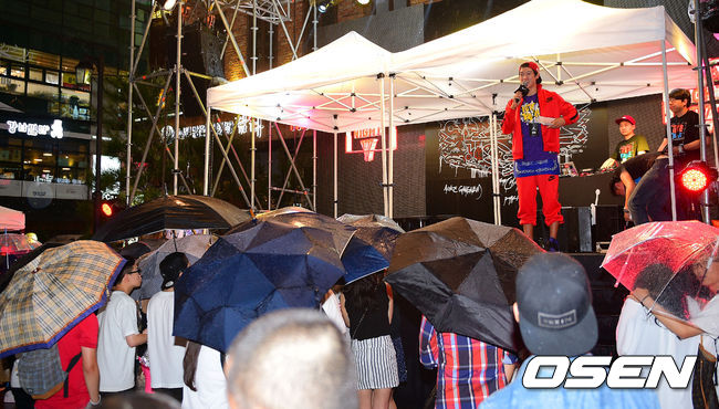 21일 서울 역삼동 나이키 강남 플래그십 스토어에서 진행된 '스니커즈 데이(SNEAKERS’ DAY): 조던 나이트(JORDAN NIGHT)'행사에서 사회를 맡은 방송인 박재민이 폭우 속에서진행을 하고 있다.