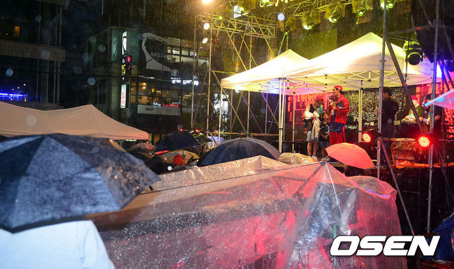 21일 서울 역삼동 나이키 강남 플래그십 스토어에서 진행된 '스니커즈 데이(SNEAKERS’ DAY): 조던 나이트(JORDAN NIGHT)'행사에서 사회를 맡은 방송인 박재민이 폭우 속에서진행을 하고 있다.
