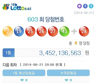당첨번호 6개가 일치해야 하는 로또 603회 1등 당첨자는 총 4명이다. 로또 603회 1등 당첨금은 1인당 34억 5213만 6563원 이다.