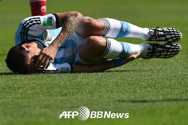 전반 아르헨티나 앙헬 디 마리아가 이란 수비에 걸려 넘어져 괴로워하고 있다.