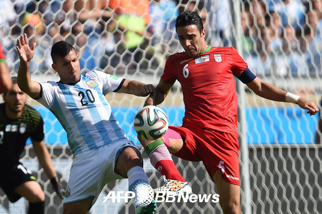 전반 이란 네쿠남이 아르헨티나 아게로를 막아내고 있다.
