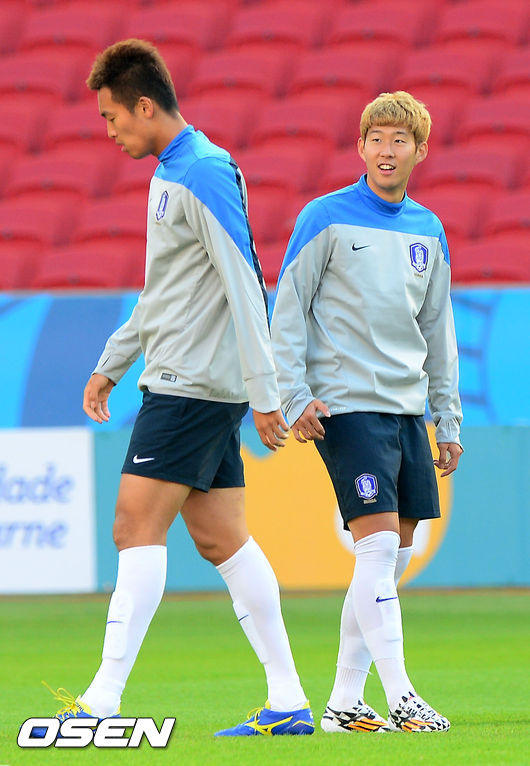 22일 오전(이하 한국시간) 홍명보 감독이 이끄는 축구국가대표팀이 브라질 포르투 알레그리의 에스타디오 베이라 히우 경기장에서 훈련을 가졌다. 그라운드 위에서 손흥민이 김신욱과 얘기를 나누고 있다.
