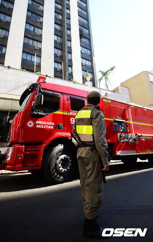 한국 기자단 숙소 화재를 걱정스럽게 바라보는 브라질 경찰