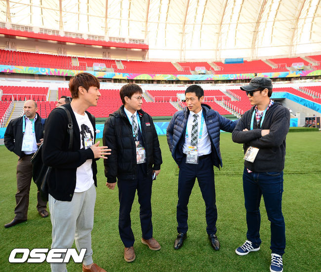 22일 오전(이하 한국시간) 홍명보 감독이 이끄는 축구국가대표팀이 브라질 포르투 알레그리의 에스타디오 베이라 히우 경기장에서 훈련을 가졌다. 서지석, 조우종 아나운서, 이영표, 송종국이 그라운드 위에서 얘기를 나누고 있다.