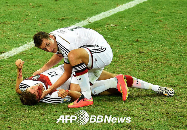 경기 종료 직전 독일 토마스 뮐러가 헤딩 경합 중 상대와 부딪혀 피를 흘리고 있다./photo@osen.co.kr