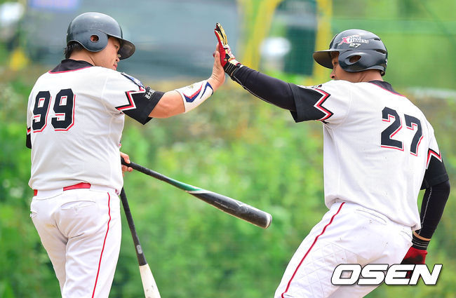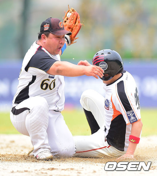 안양GMB 박수현이 3회 GStorms 이정환의 도루를 저지하고 있다. 아래 사진은 서대전의 강정태가 4회 백투백 홈런을 때리고 동료들과 하이파이브를 하고 있는 모습. /박준형 기자 soul1014@osen.co.kr