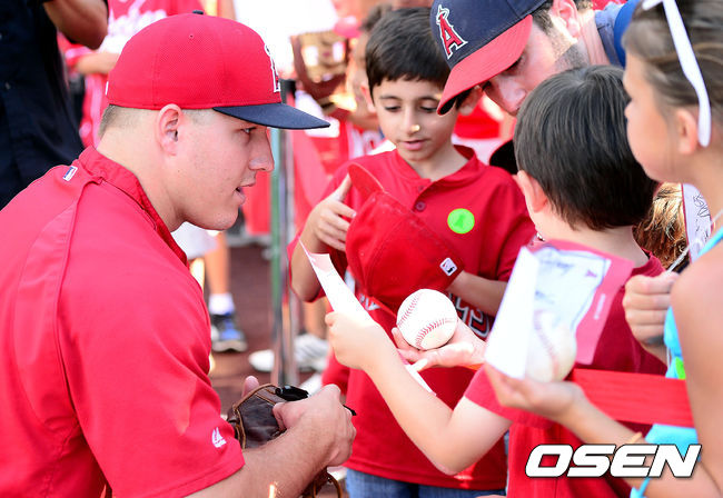 22일(한국시간) 미국 캘리포니아주 애너하임 에인절스타디움에서 열리는 '2014 메이저리그' LA 에인절스와 텍사스 레인저스의 경기에 앞서 에인절스 트라웃이 어린 아이들에게 사인을 해주고 있다.