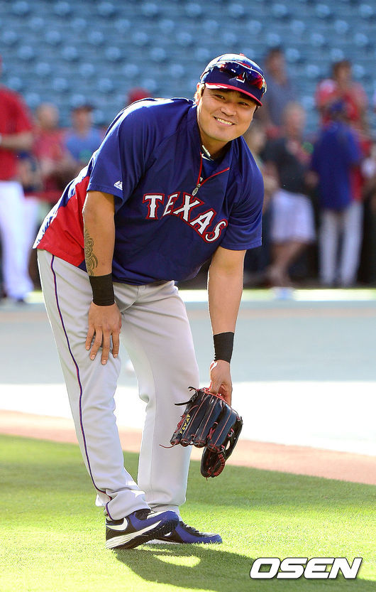 22일(한국시간) 미국 캘리포니아주 애너하임 에인절스타디움에서 열리는 '2014 메이저리그' LA 에인절스와 텍사스 레인저스의 경기에 앞서 텍사스 추신수가 동료와 이야기를 나누며 미소를 짓고 있다.