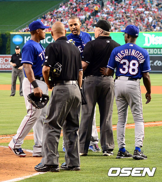4회초 시작전 텍사스 리오스가 구심에게 항의하고 있다.