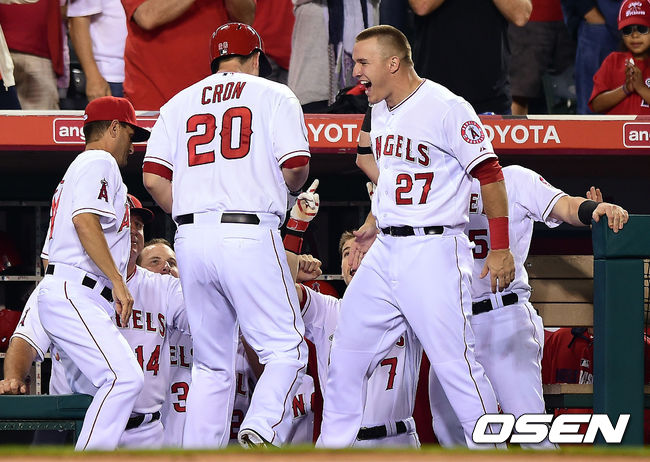 8회말 무사 에인절스 크론이 솔로 홈런을 때린 뒤 동료들과 기뻐하고 있다.