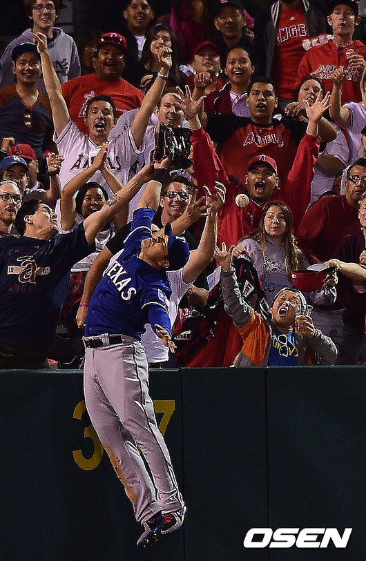 8회말 무사 텍사스 추신수가 에인절스 크론이 홈런 타구를 잡기위해 점프캐치를 시도하고 있다.